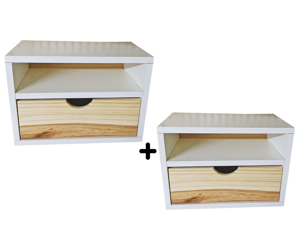 COMBO X 2 Mesas de Luz Flotantes con Repisa - Estilo Nórdico con Cajones - CON ENTREGA INMEDIATA ¡SIN COSTO DE EMBALAJE Y LISTAS PARA USAR! AHORA EN PINO Y MELAMINA. Podes guardar: control de TV - Libros - Accesorios y mucho más!
